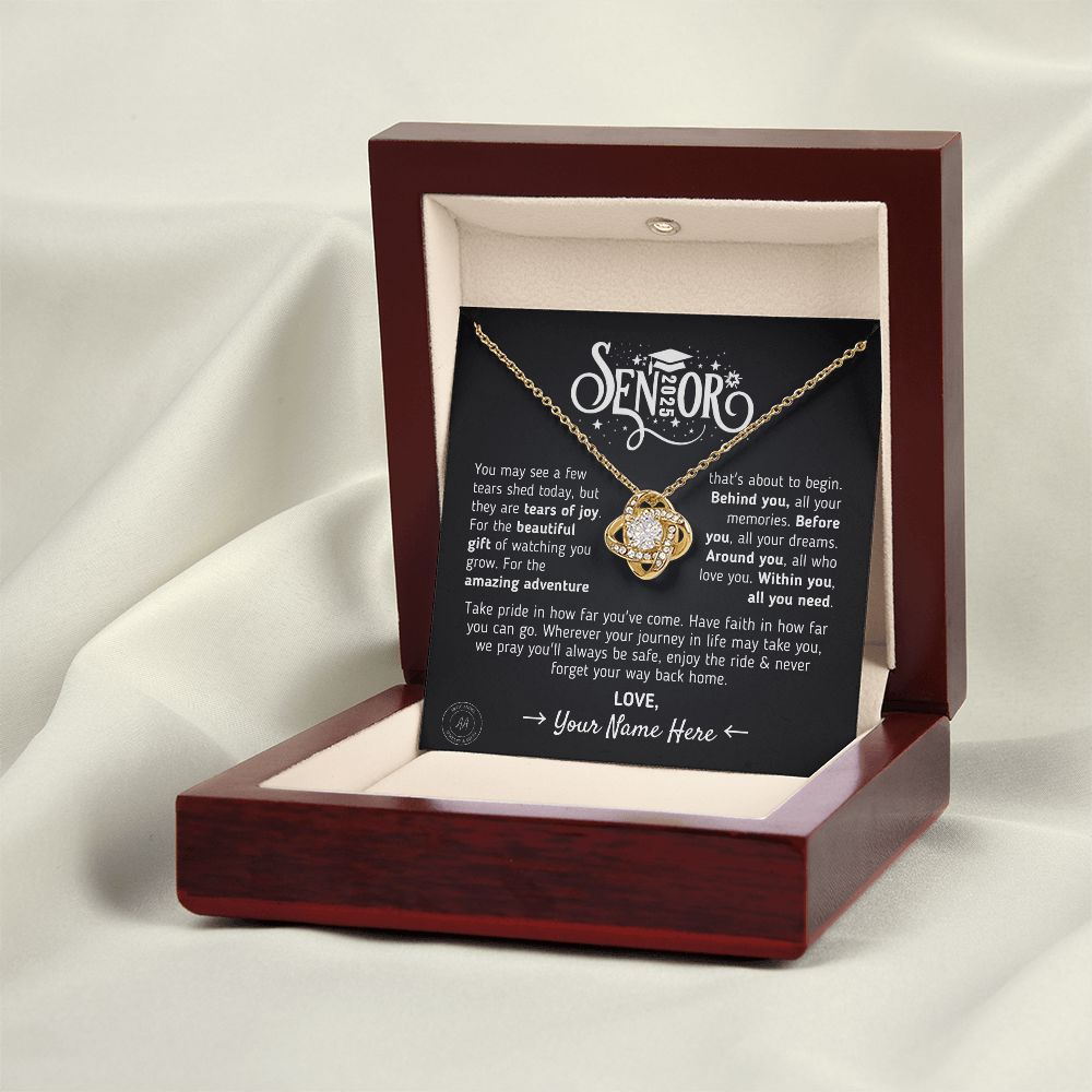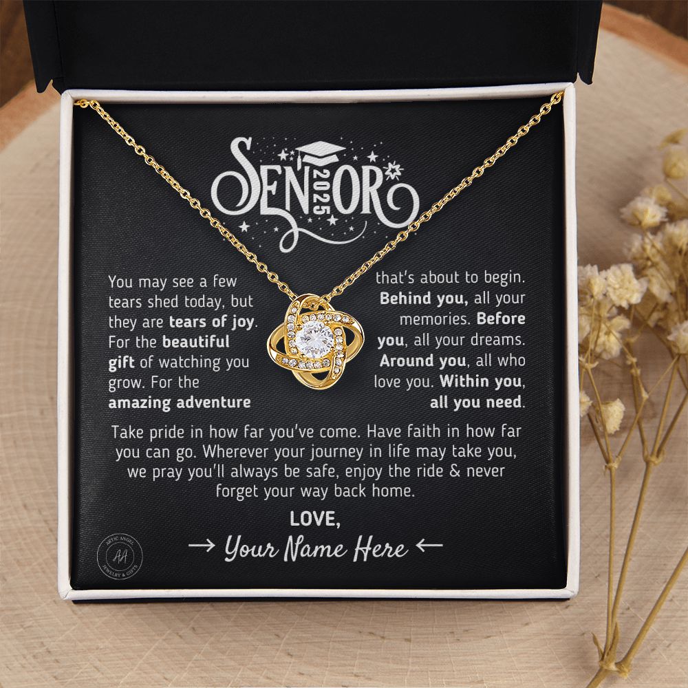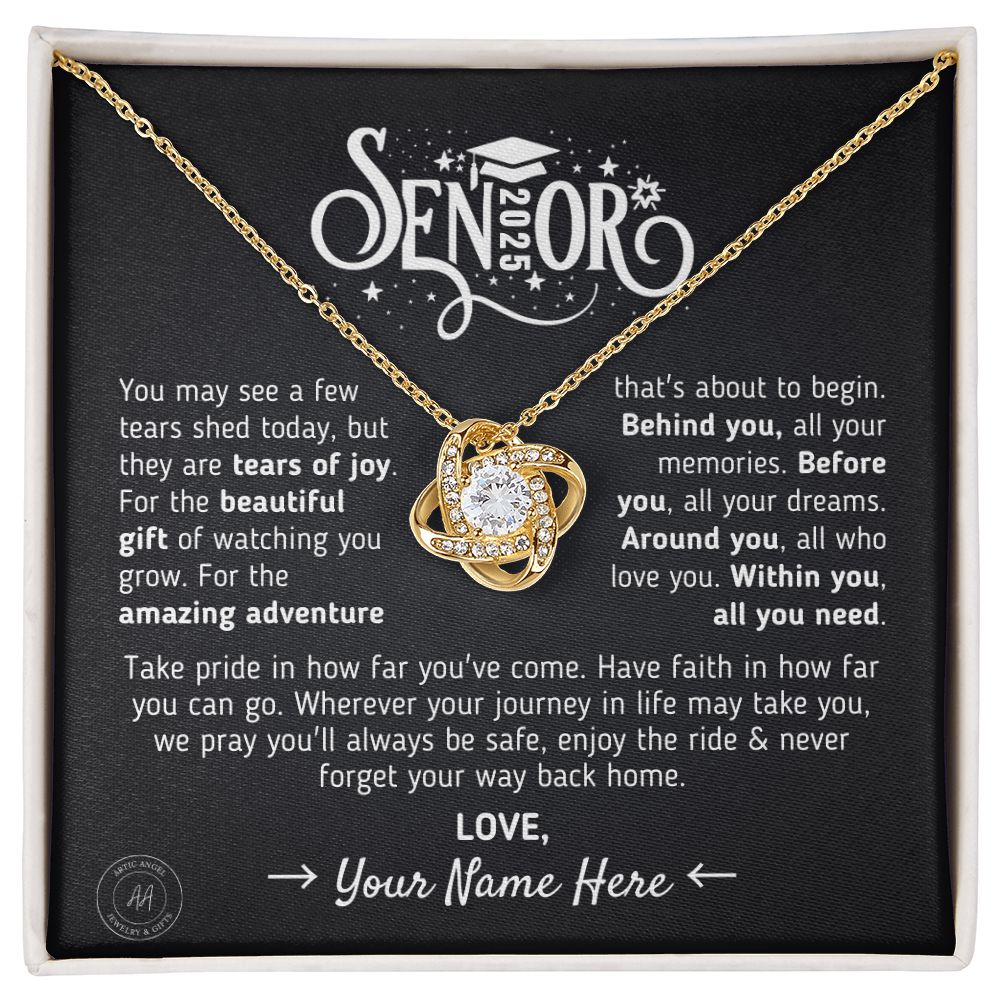 The Message Says: "Senior [Custom Year] - You may see a few tears shed today, but they are tears of joy. For the beautiful gift of watching you grow. For the amazing adventure that's about to begin. Behind you, all your memories. Before you, all your dreams. Around you, all who love you. Within you, all you need. Take pride in how far you've come. Have faith in how far you can go. Wherever your journey in life may take you, we pray you'll always be safe, enjoy the ride & never forget your way back home. Love, YOUR CUSTOM SIGN OFF."